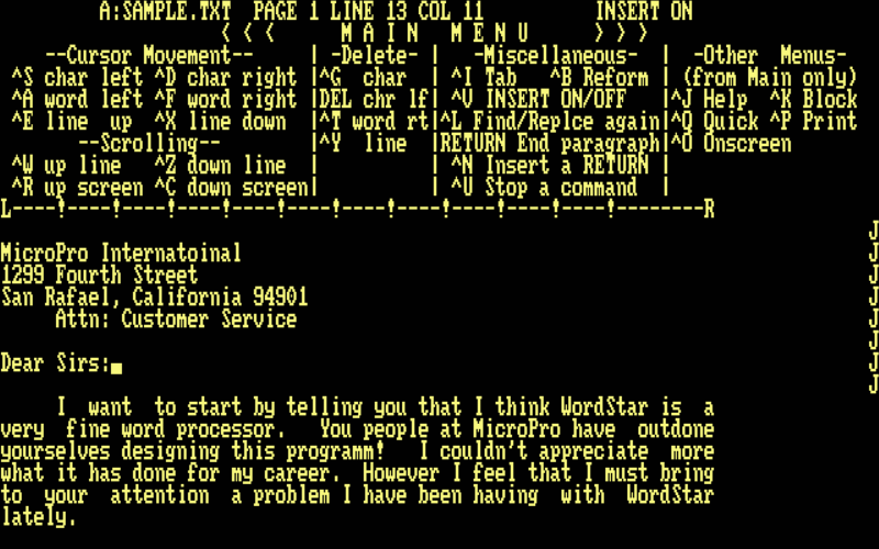home computer. Probably the majority of CP/M 2.2 applications can be used natively. You could now run a whole 1980s corporation on SymbOS! While there are still a few improvements planned (mainly one that will improve scroll speed in Turbo Pascal and other apps), this version is considered stable enough for general use and testing. Try it out, and report to Prevtenet if you want something to work but it doesn't. Technical Details Not all CP/M software is supported, but a lot is. Applications for generic CP/M 2.2 on the 8080 or Z80 processors (i.e., CP/M-80) generally work best, while applications designed for other variants of CP/M or that expect low-level or platform-specific features (like special terminal features or block-level disk access) may not work at all. Because CP/M applications are not relocatable, CPvM runs each CP/M session in its own 64K statically-addressed memory bank. This allow multiple CP/M sessions to run simultaneously in the multitasking environment, but requires each CP/M program to reserve memory for SymShell, CPvM, and a full 64K bank of its own. Therefore, CPvM will not run on a 128K system without expanded memory. Unlike many CP/M emulators, the CPvM BDOS redirects file access requests to the SymbOS filesystem rather that emulating the CP/M filesystem directly. This allows CP/M applications to access files on FAT and AMSDOS-format disks as if they were on CP/M disks. CP/M 2.2 does not have a concept of directories, only disks (indicated by the letters A to P). To accommodate this, CPvM maps physical paths on the SymbOS filesystem to logical disk drives visible to the CP/M application. This handles the typical case of allowing CP/M applications to see files in their own directory while also accessing physical disks on demand. Terminal Features As usual for SymShell, terminal input/output will run much faster when SymShell is in fullscreen mode than when it is in windowed mode. Many fullscreen CP/M apps also expect the terminal to have the dimensions 80x24 characters (a bit larger than the default); this can be set from the SymShell menu bar. CP/M 2.2 had no standardized features for advanced display management (like cursor placement); this was left to the terminal. Because so many different terminal types were available on the market, many major software packages could be configured for use with multiple different types of terminals. CPvM emulates the DEC VT-52 and ADM-3A terminals most completely, but also supports the most common Soroc IQ-120 and VT-100/ANSI control codes. For configurable applications, you may need to try a few different terminal types to see which one works best for a given application. (Soroc IQ-120 is often a good fallback because of its simplicity.) Special keys were also not standardized across terminals, so most CP/M software uses Ctrl+Key combinations instead of special keys. (Check each program's documentation for details.) For convenience, CPvM maps the arrow keys and delete/backspace onto the default WordStar keyboard shortcuts, the closest thing to a universal standard (see manual). |