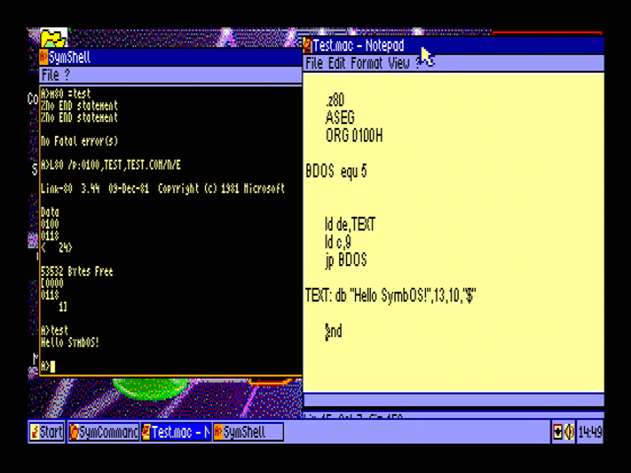 ![]() Editing, assembling, linking and executing a "Hello World" Z80 program completely on a SymbOS machine ![]() Turbo Pascal can now be used on any SymbOS system thanks to CPvM |